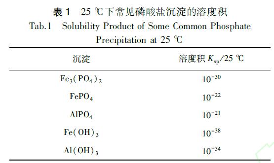 不溶性磷酸鹽沉淀物的溶度積在一定程度上也會影響除磷劑的除磷效果。根據溶度積原理,相同類型的難溶電解質Ksp越小,溶解度越小,從而越容易生成沉淀,磷的去除效果越好;反之,K越大,溶解度越大,去除效果越差。了解不同沉淀物的溶度積,可以為選擇除磷劑提供參考。一些常見沉淀的溶度積如表1所示。