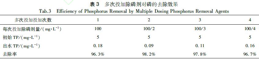 根據一次投加效果,選擇除磷效果較佳的污水除磷劑進行多次投加試驗。選擇污水除磷劑投加量為100mg/L,按照多次投加次數對除磷劑投加總量進行等量均分后進行投加,結果如表3所示。