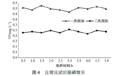 連續流試驗時采用如圖3所示流程,選擇污水除磷劑投加量為90mg/L,討論一次投加與二次投加方式的除磷效果。一.次投加時,在混合池中一次性投加除磷劑;二次投加時,次投加在混合池,第二次投加在反應池。混合池攪拌速度約為300r/min,在混合池反應30~40s后進入反應池,反應池攪拌速度為150 r/min,反應約5min后,進入沉淀池,經20~25min流至出水口。每30min取出水進行指標檢測,磷去除效果如圖4所示。試驗發現,初始TP為5mg/L,二次投加除磷劑時,出水TP可以穩定達到地表水IV類標準,且出水TP明顯低于一次投加,這與靜態試驗結果相符。二次投加時磷去除率比一次投加增加了約4%,因此選擇二次投加除磷劑的方式是可行的,實際工程中可選擇使用兩組計量泵恒量投加除磷劑的方式。投加除磷劑后,出水濁度從2.63NTU降低至0.99NTU,去除率達到了62.4%,但是對水中COD卻無明顯去除效果,分析原因為校園的水中COD為溶解性COD,通過化學混凝的方法對其無去除作用。