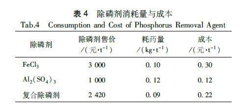 按照處理TP為5mg/L的生活廢水達到地表水IV類標準計,需消耗除磷劑量與成本估算如表4所示。